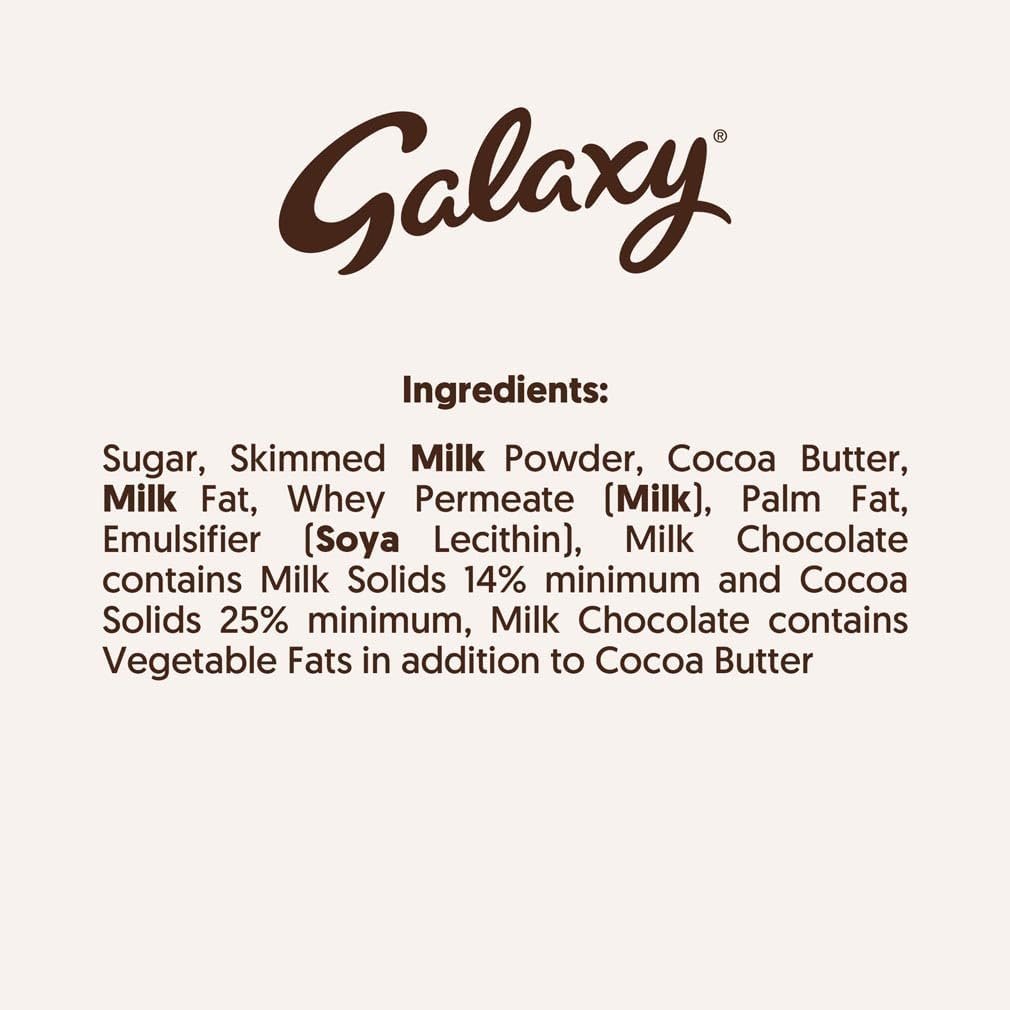 • 1 x 360g Galaxy Smooth Milk Chocolate Bar. Suitable for vegetarians and certified by Rainforest Alliance.