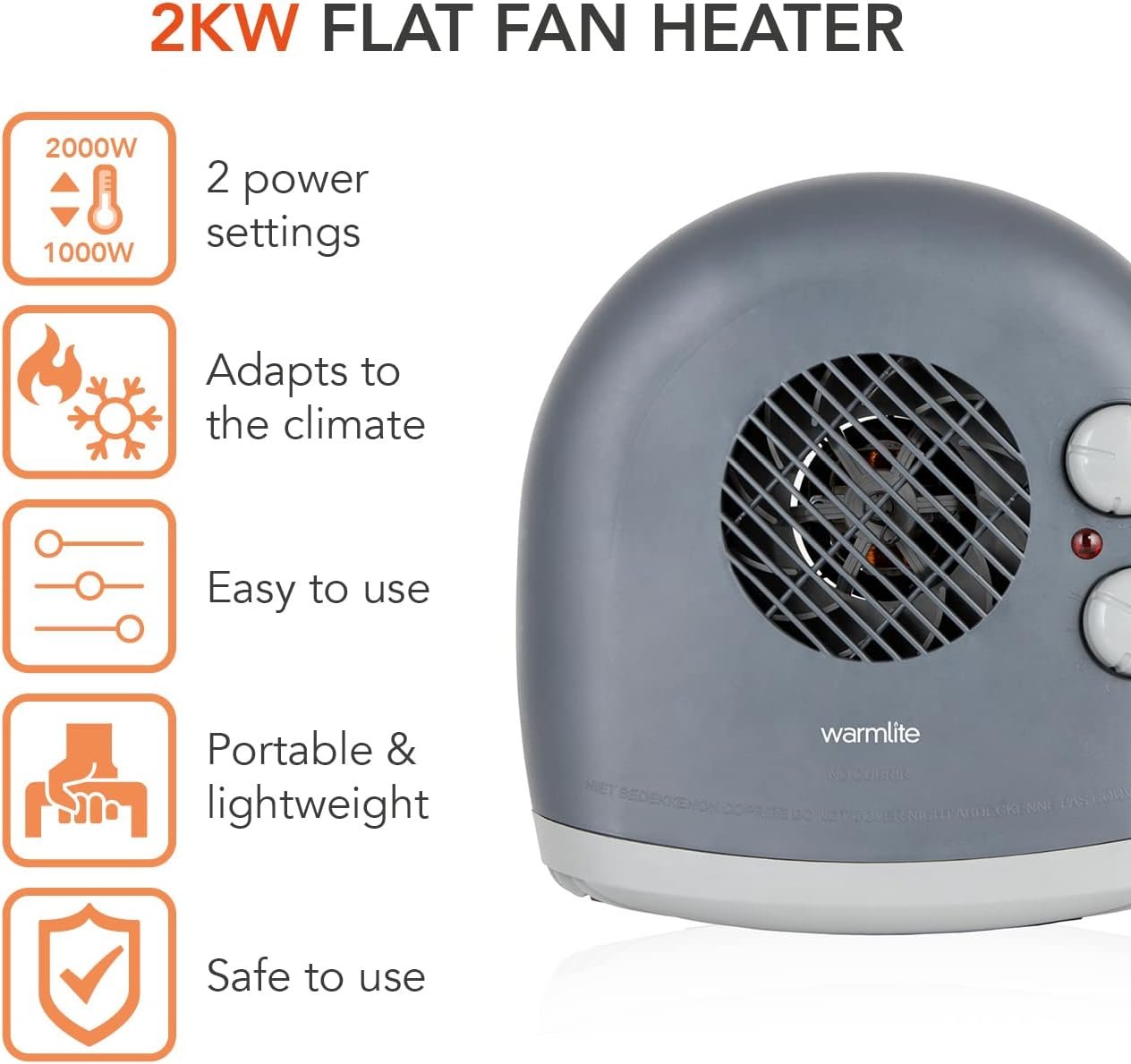 Warmlite WL44004DT 2000W Portable Flat Fan Heater with 2 Heat Settings and Overheat Protection