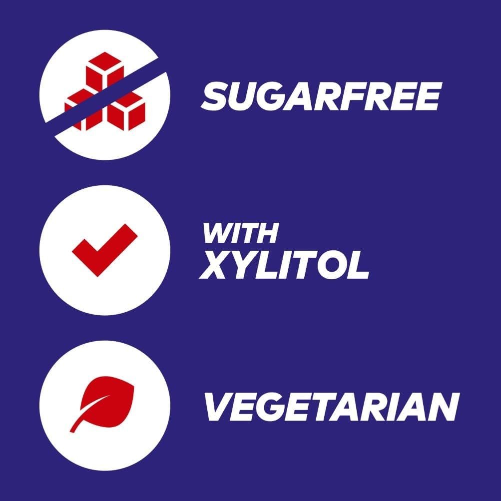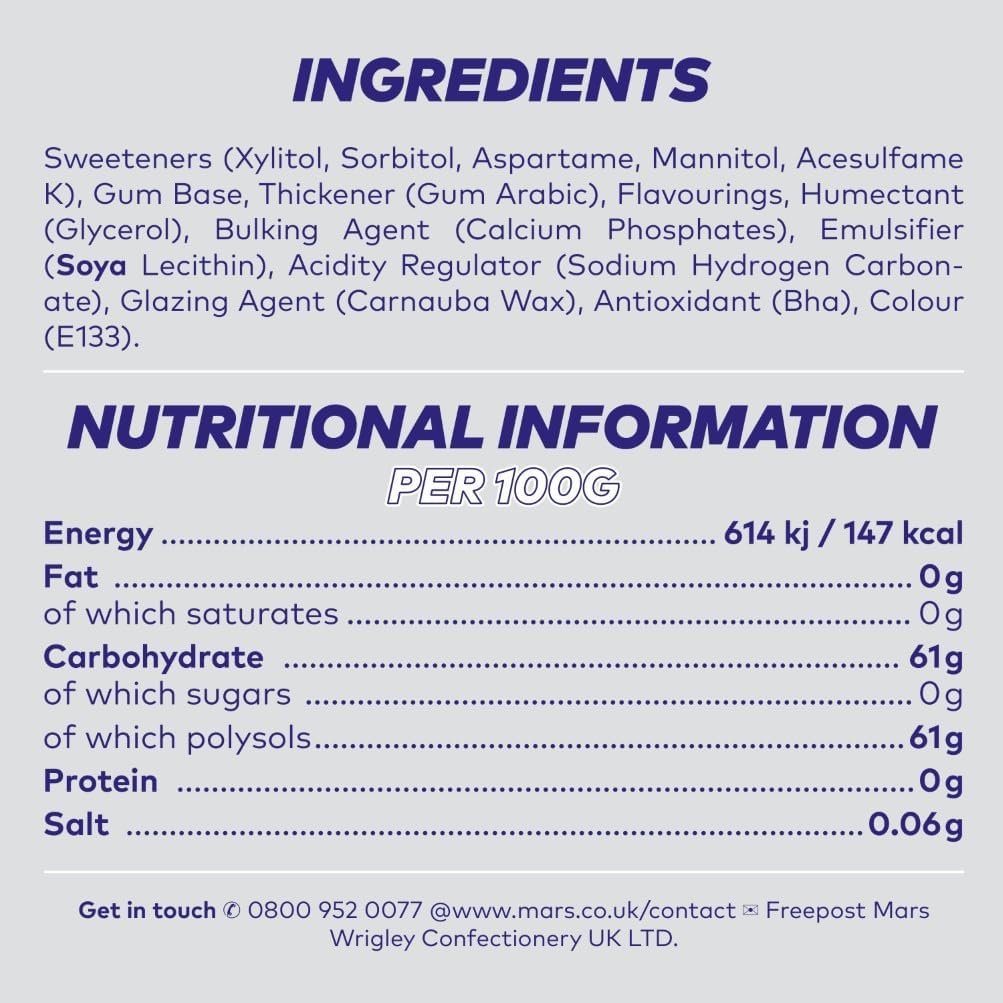 Sweeteners (Xylitol, Sorbitol, Aspartame, Mannitol, AcesulfameK), Gum Base, Thickener (Gum Arabic), Flavourings, Humectant (Glycerol), Bulking Agent (Calcium Phosphates), Emulsifier (SOYA Lecithin), Acidity Regulator (Sodium Hydrogen Carbonate), Glazing Agent (Carnauba Wax), Antioxidant (Bha), Colour (E133)